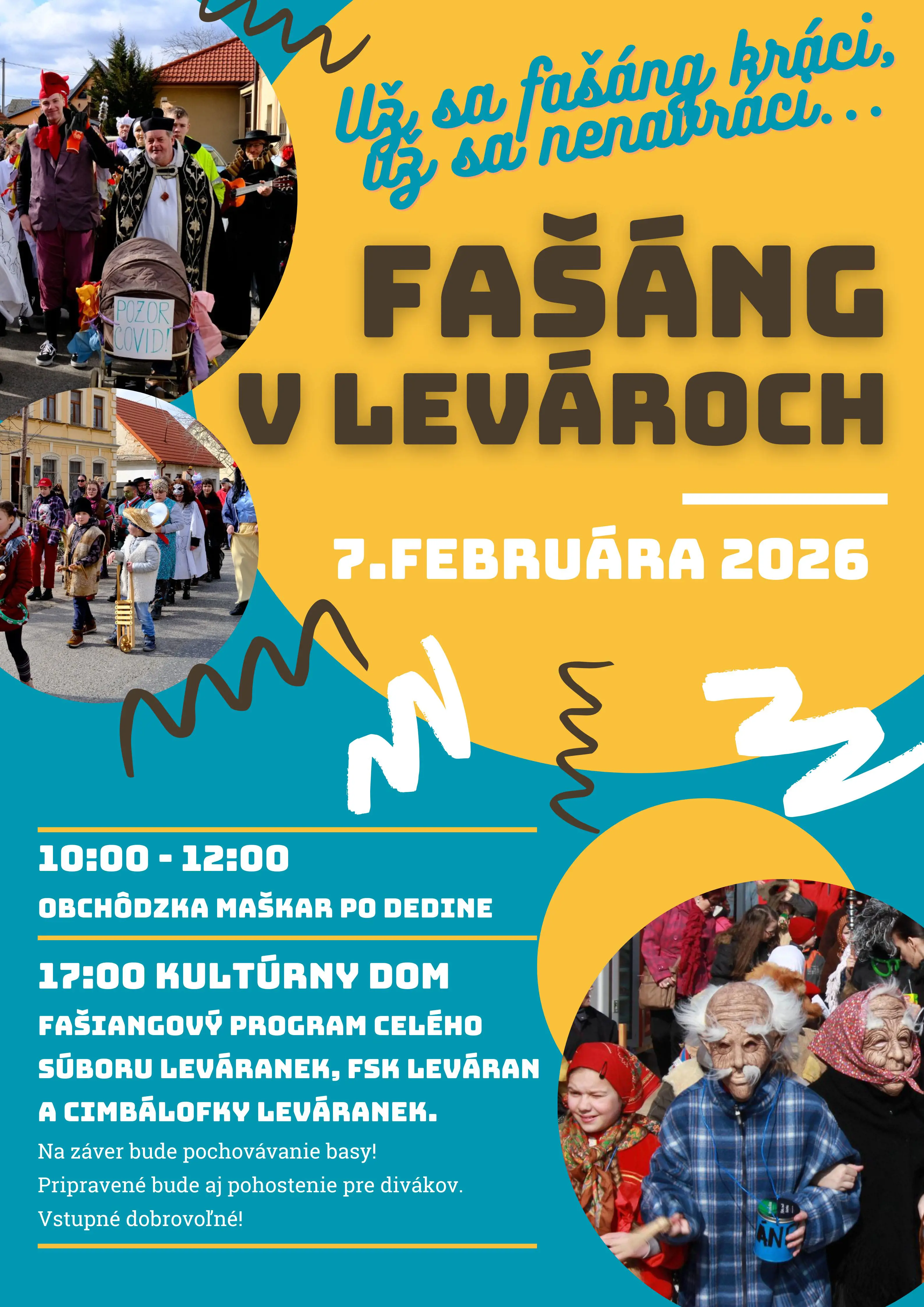 Pozývame vás na Fašáng v Levároch, ktorý sa uskutoční v sobotu 7.februára 2026. Od 10:00 h. do 12:00 h. budú po obci v sprievode chodiť maškary. Koho stretnú, toho vytancujú.