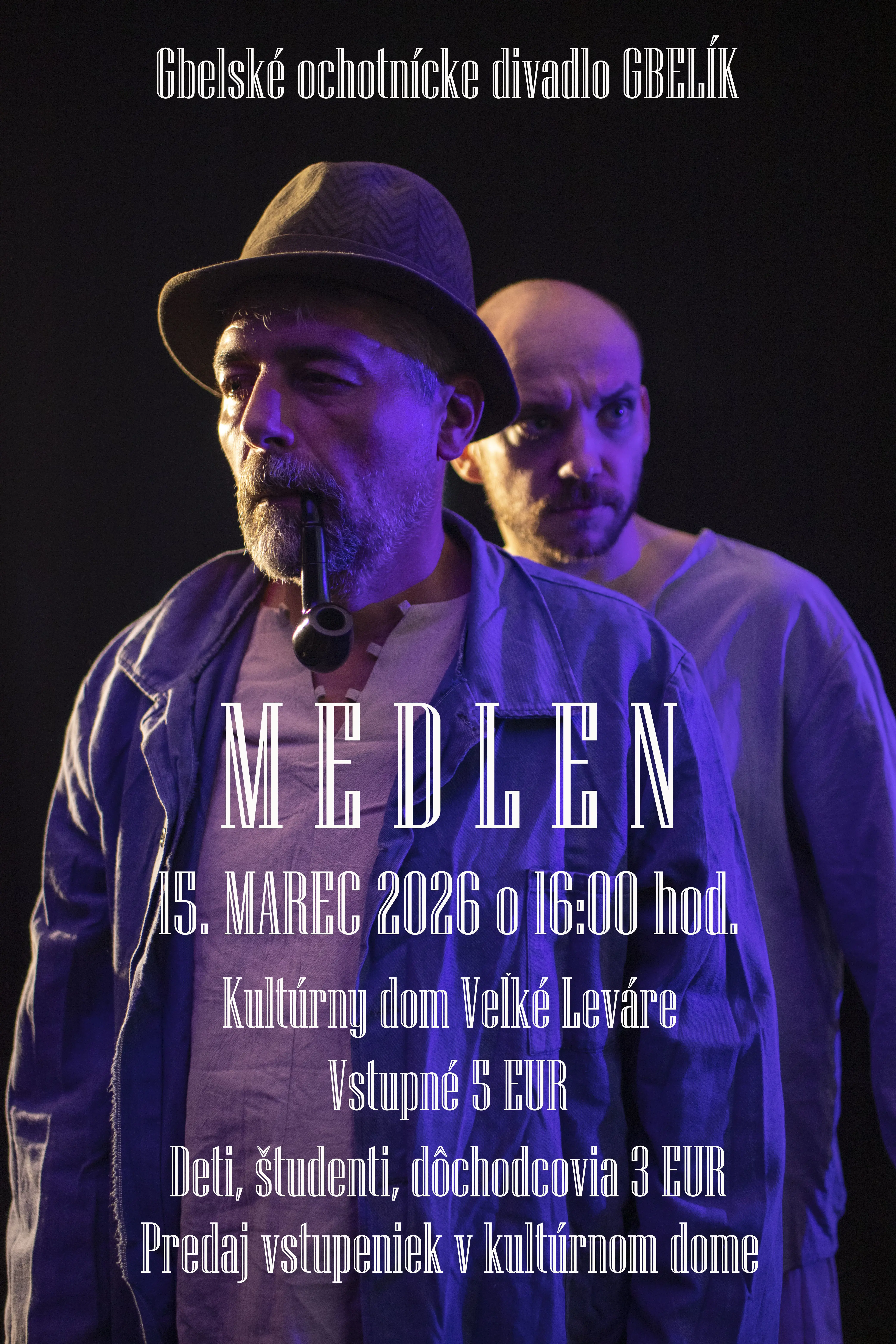Pozývame Vás na divadelné predstavenie MEDLEN. Gbelské ochotnícke divadlo Gbelík výstúpi v kultúrnom dome vo Veľkých Levároch v nedeľu 15.marca 2026 o 16.00 hod.